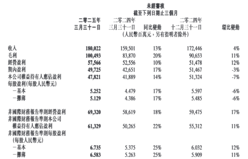金融科技及企业服务业务2025年第一季的收入同比增长5%至549亿元。金融科技服务收入的增长乃由于消费贷款服务及理财服务收入增长。企业服务收入的增长乃受云服务收入及商家技术服务费的增长所驱动。